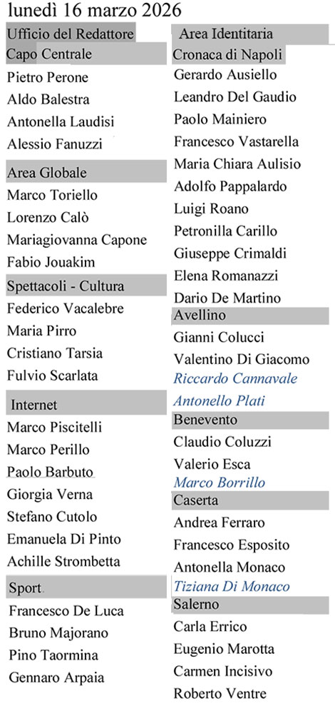| A metà marzo il Mattino ha in organico, oltre al direttore Vincenzo Di Vincenzo e al vice Vittorio Del Tufo, quarantacinque giornalisti e quattro pubblicisti contrattualizzati con articolo 36: Riccardo Cannavale e Antonello Plati ad Avellino, Marco Borrillo a Benevento, Tiziana Di Monaco a Caserta, Tre redattori lavorano in smart working: Maria Chiara Aulisio, Francesco Esposito e Maria Pirro. |
