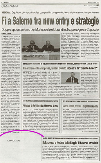 L’immaginazione, per fortuna, non manca ai cronisti del Roma, quotidiano con guida a tre teste (il direttore editoriale Antonio Sasso, il responsabile Pasquale Clemente, il vice direttore Roberto Paolo) che nel numero dell’11 luglio, a pagina 6 lanciano la pubblicità formato 2x3 che in pagina non c'è. Due le ipotesi: 1) assenza di inserzionisti, e personalmente mi auguro di no; 2) mancato inserimento della manchette pubblicitaria. |