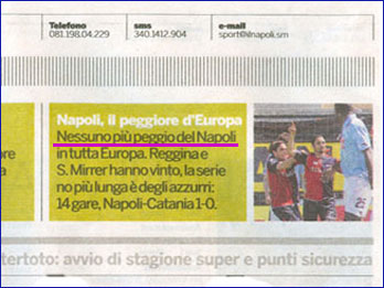 Il nuovo profeta del calcio senza virgole e senza esitazioni è Francesco Modugno di E-Polis Napoli. Chissà, forse è nata una nuova stella nel firmamento del giornalismo sincopato. Datemi un punto e vi solleverò il mondo. Datemene una confezione e vi trasformo una cronaca sportiva in un thriller da togliere il fiato. Lunedì 20 aprile Modugno ci resoconta sulla sconfitta del Napoli a Cagliari (2-0, reti di Jedaias Capucho Neves e Andrea Lazzari). L’ennesima di una stagione iniziata con la dinamite e finita con i tric trac. L’amarezza è grande, e il cronista di E-Polis gira il coltello nella piaga proponendo un box in cui si evidenzia il cammino fallimentare della squadra ora affidata a Roberto Donadoni. Sapevate che il Napoli è in assoluto la squadra che negli ultimi tre mesi ha fatto meno punti in Europa? Addirittura meno del S. Mirren, quart’ultimo posto nella Scottish Premier League dove giganteggia Shunsuke Nakamura, che però Modugno, forse contrariato per aver terminato i punti, chiama S. Mirrer. Ma l’amarezza, in quel box, si taglia a fette: Nessuno più peggio del Napoli in tutta Europa. Reggina e S. Mirrer hanno vinto, la serie no più lunga è degli azzurri”.