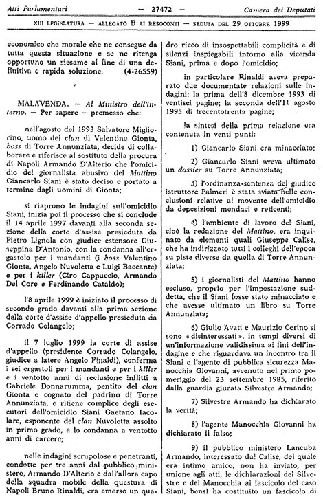 Nell’ottobre del 1999 Mara Malavenda, sindacalista Slai Cobas attiva soprattutto all’Alfa Romeo di Pomigliano d’Arco e deputata di Rifondazione Comunista, presenta una interrogazione parlamentare al ministro dell'Interno Rosa Russo Iervolino nella quale recupera per intero le conclusioni della prima relazione sulle indagini per l’omicidio di Giancarlo Siani ripartite dopo le rivelazioni del pentito Salvatore Migliorino. La relazione, datata 8 dicembre 1993, è firmata dal capo della squadra mobile di Napoli Bruno Rinaldi.